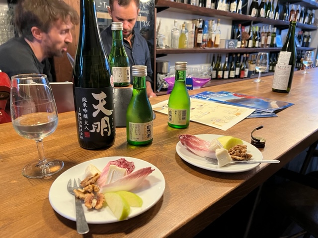 パリ市内のワインバーで現地のおつまみとともに、黒の天明、にいだしぜんしゅを楽しむ…