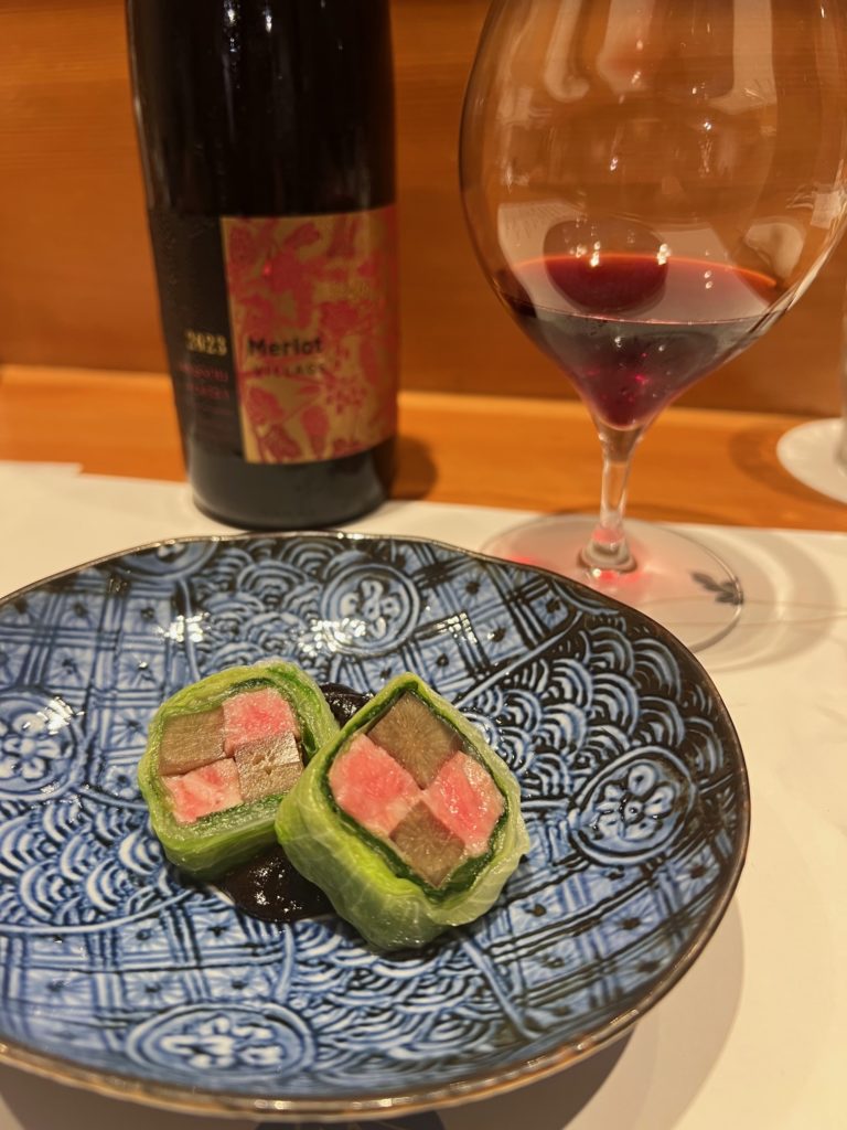 福島牛と牛蒡レタス巻き田楽みそ+かわうちワイン・メルロー2023